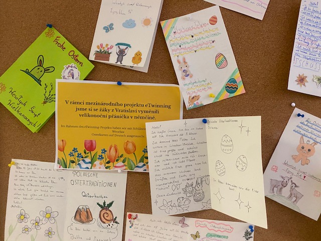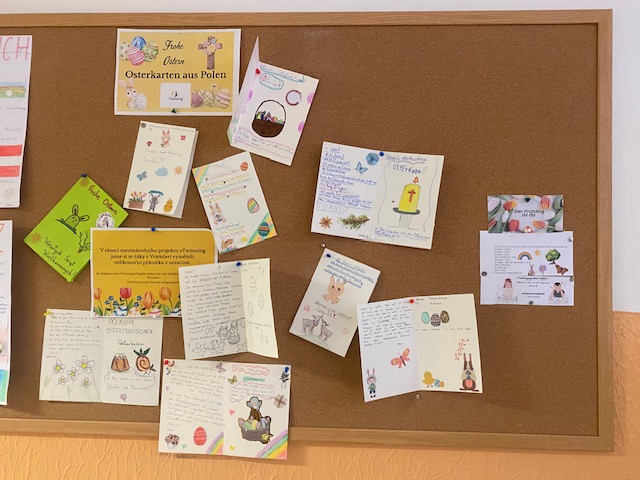 Žáci 8. ročníků v hodinách němčiny tvořili velikonoční přání (Osternkarten) pro žáky z Polska. Přání psali v němčině a následně si je vzájemně vyměnili prostřednictvím pošty. V hodinách si poté zahráli aktivitu ve Wordwallu, kde si ověřili informace o žácích, které se dočetli v přáníčkách.