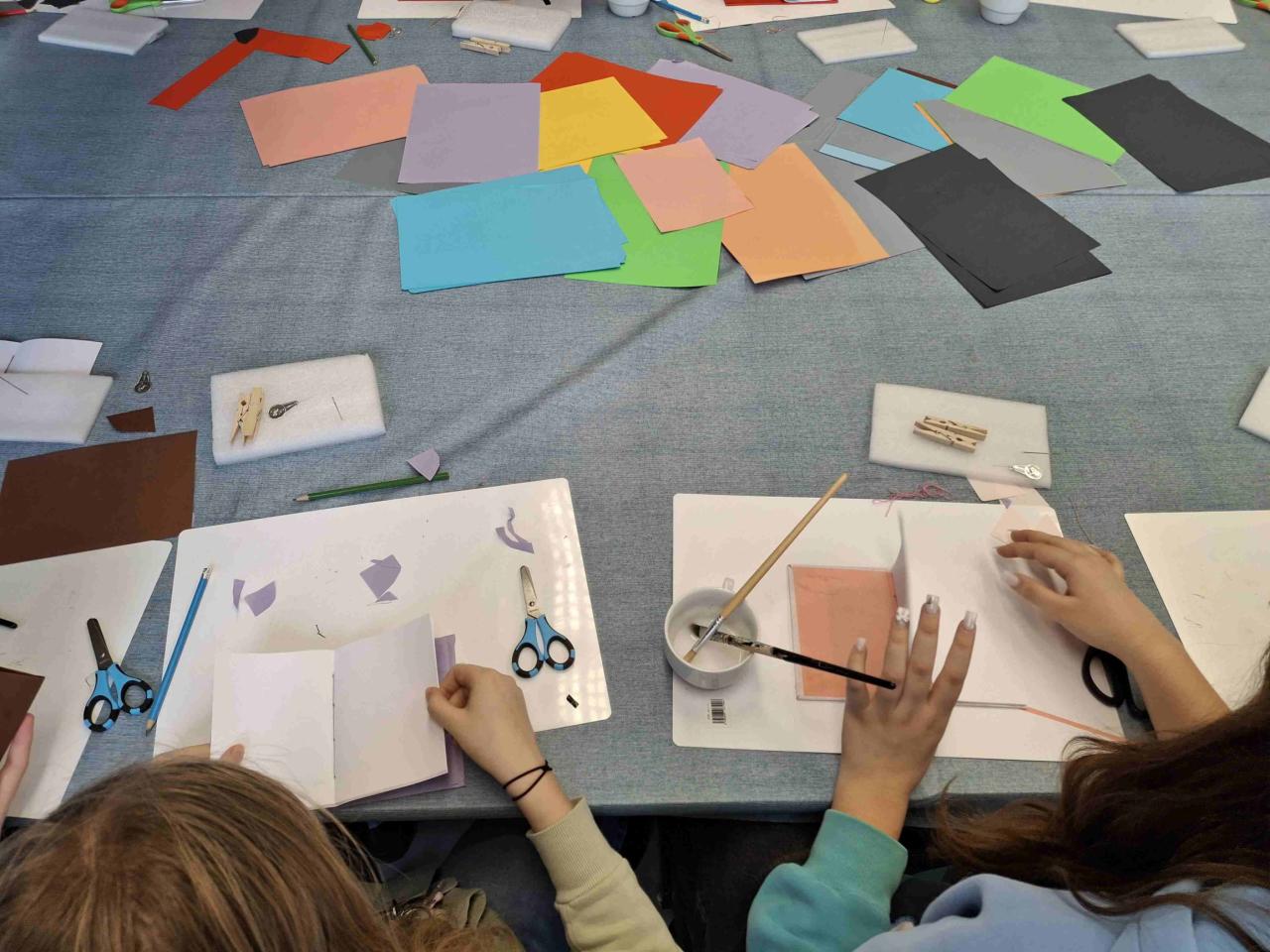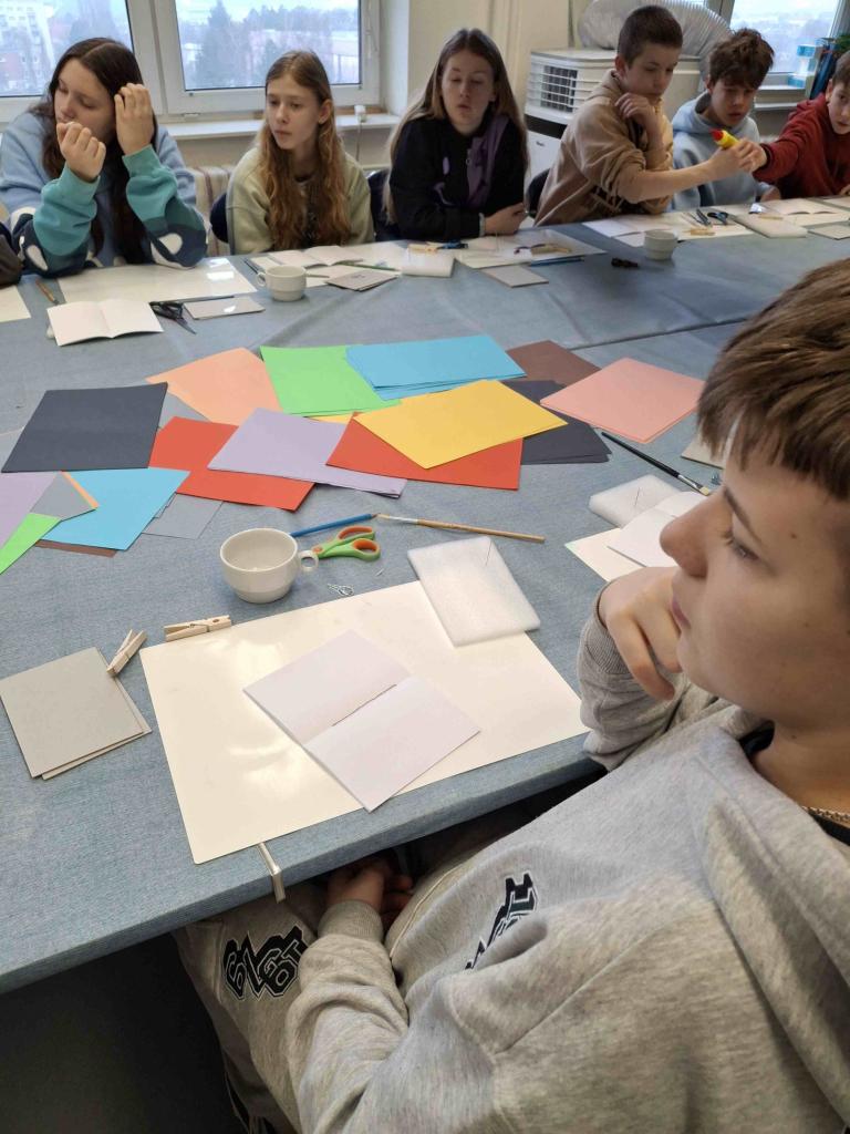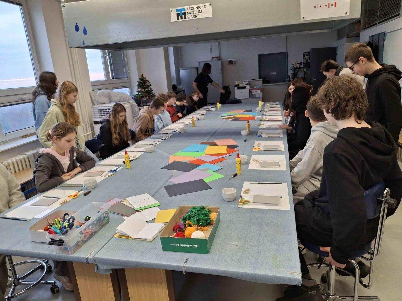 V Technickém muzeu už měly děti od dvou milých lektorek připraveno vše potřebné – bílé listy papíru, lepenku na desky zápisníku, šídlo, jehlu, nit, lepidlo, barevné papíry a další nezbytnosti. Pak se všichni zabrali do soustředěné práce a po hodině každý držel v ruce svůj vlastnoručně vyrobený zápisník. Kdo ví, třeba se někdo z nich bude řemeslu knihařskému věnovat.