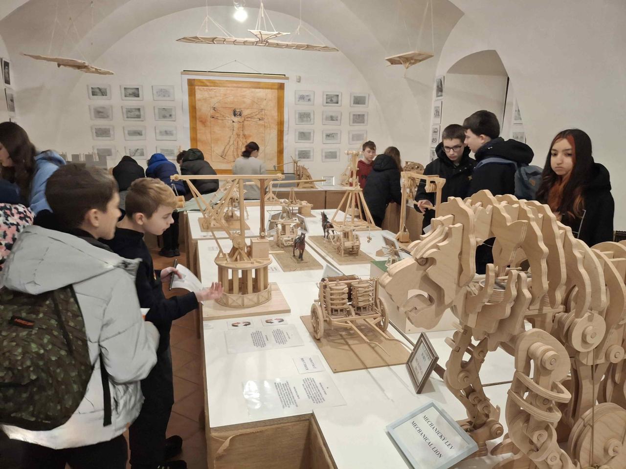 hřebíku. Děti tak mohly obdivovat například kolesový parník, jeřáb, využití principu kladky, hydraulické kladivo, tank a mnoho dalšího. Některé z dětí výstava Leonardových vynálezů zaujala natolik, že se pokoušely přímo na výstavě složit Leonardův samonosný most, jeden z hochů si materiál na jeho výrobu u pana Mužíka rovnou zakoupil.