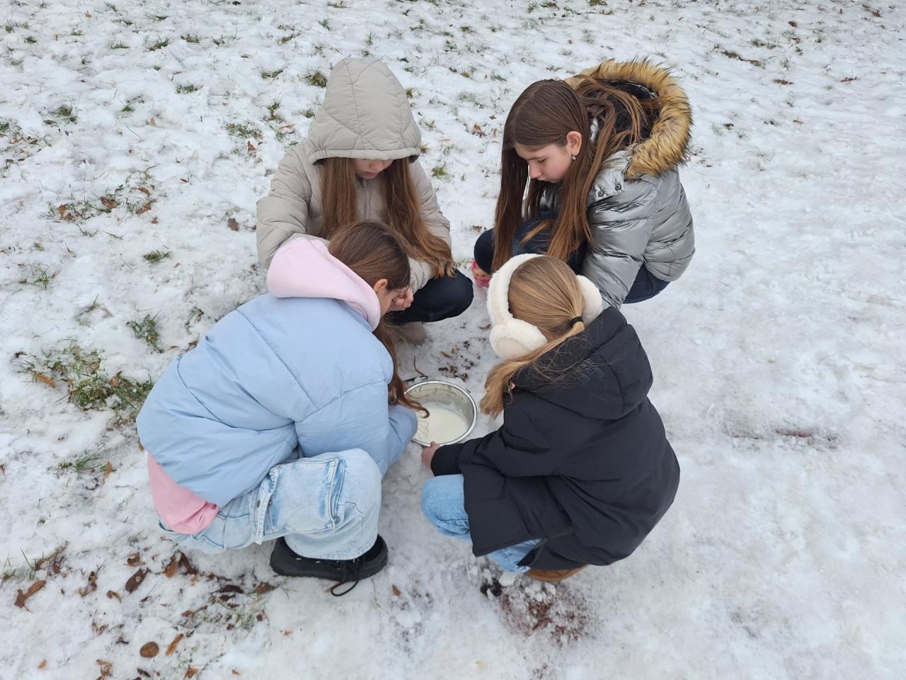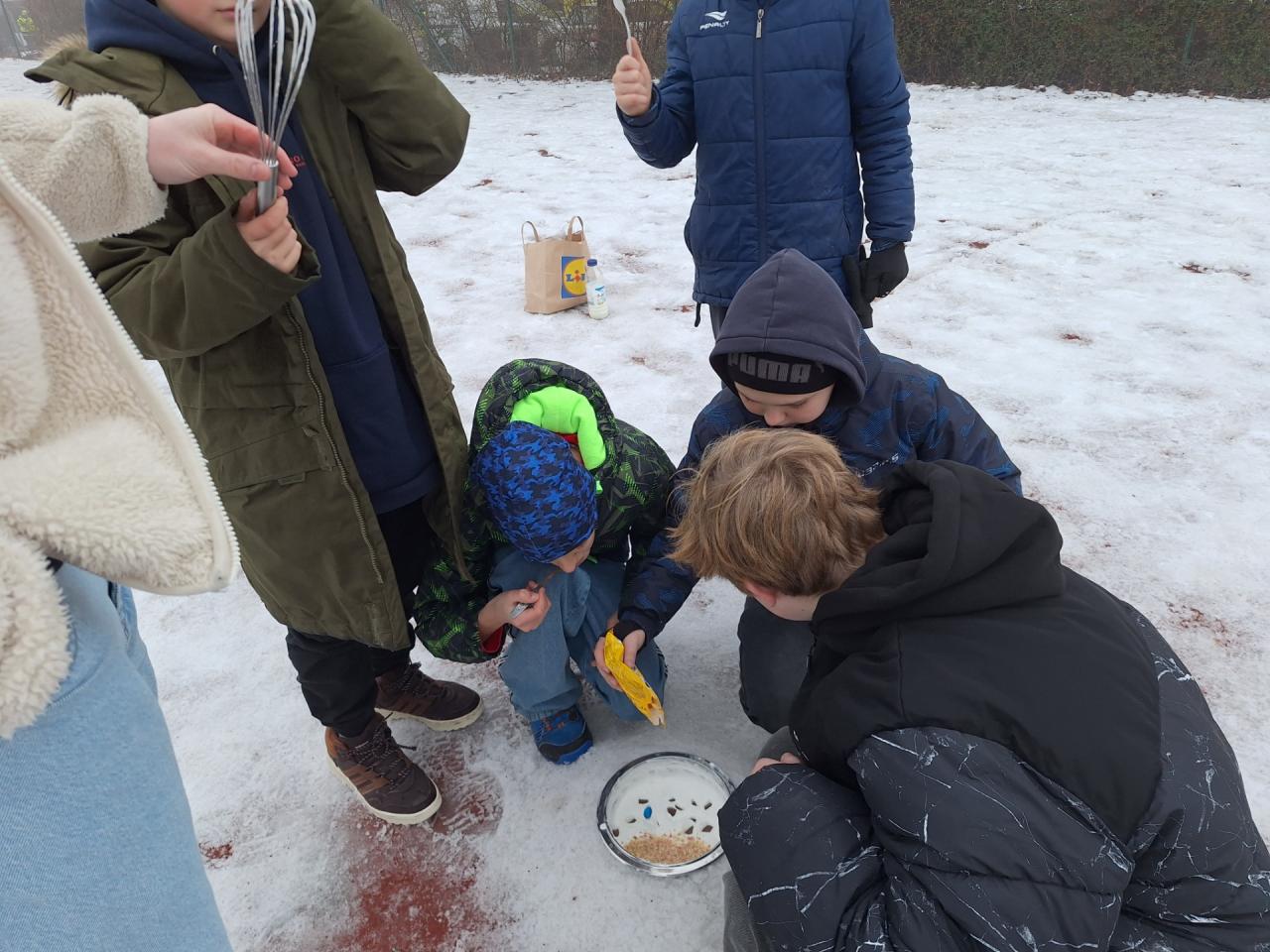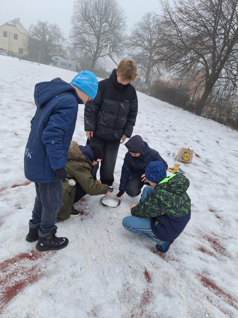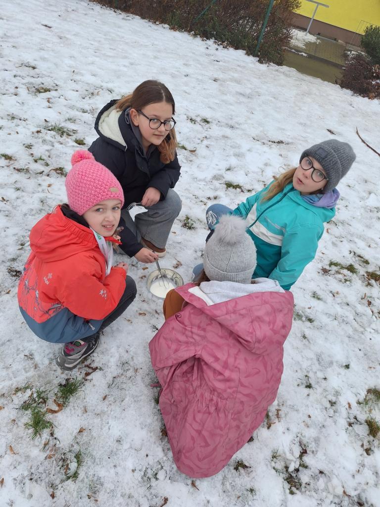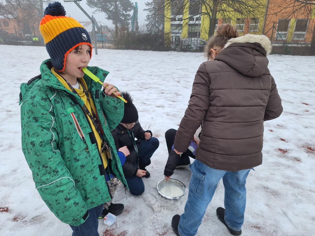 V hodině tělesné výchovy si třída 5.A užila netradiční zimní aktivitu na čerstvém vzduchu. Spojili jsme pohyb venku s jednoduchým experimentem – výrobou zmrzliny ze smetany přímo ve sněhu.