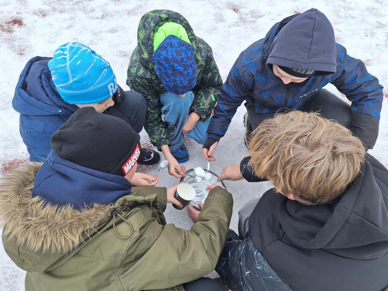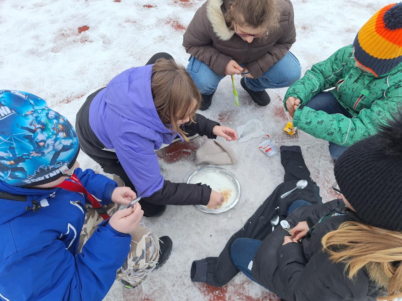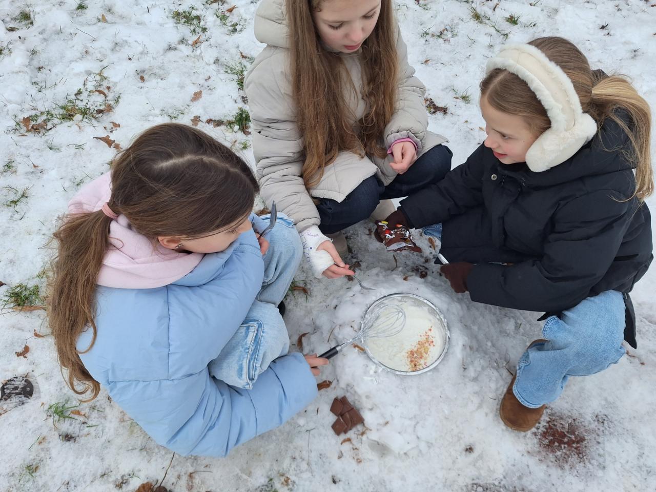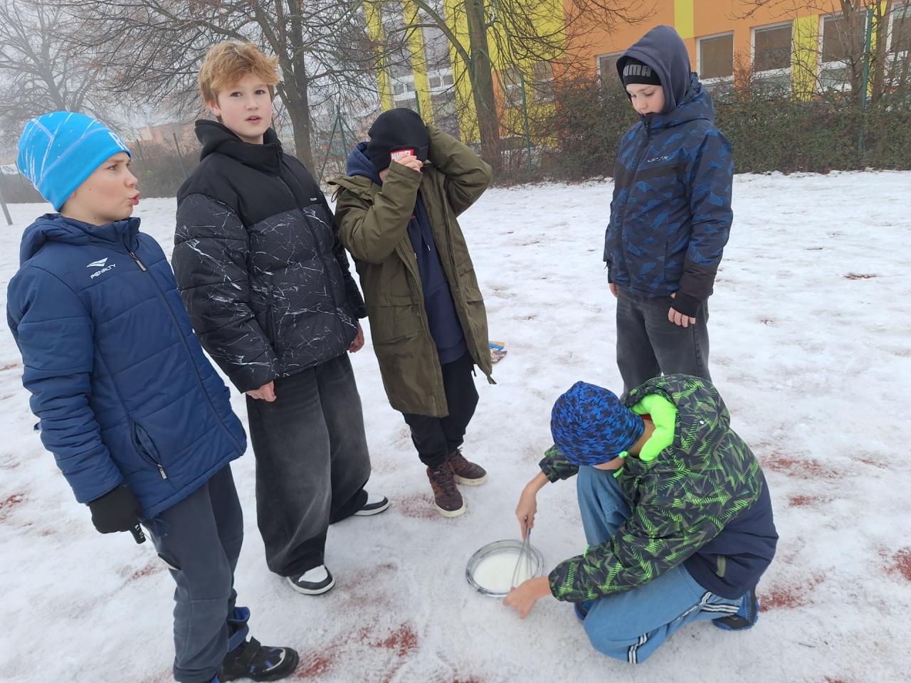 V hodině tělesné výchovy si třída 5.A užila netradiční zimní aktivitu na čerstvém vzduchu. Spojili jsme pohyb venku s jednoduchým experimentem – výrobou zmrzliny ze smetany přímo ve sněhu.