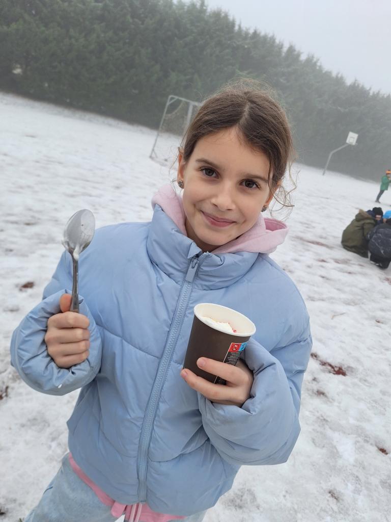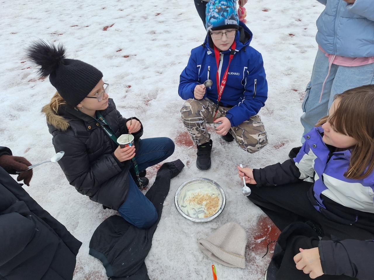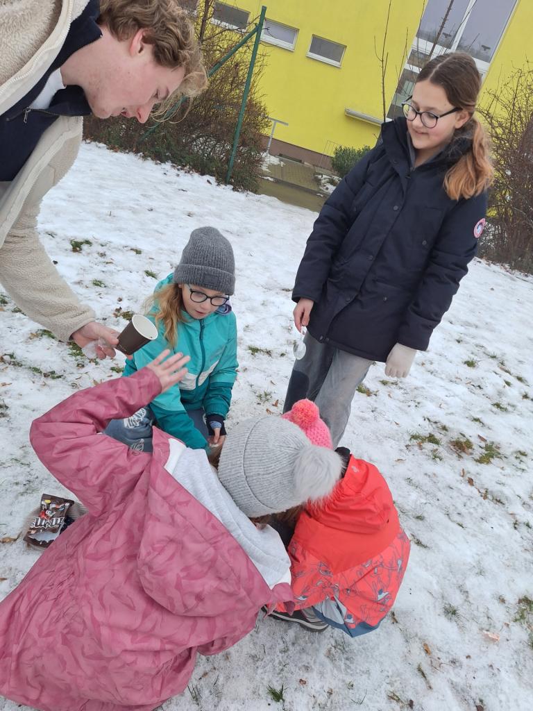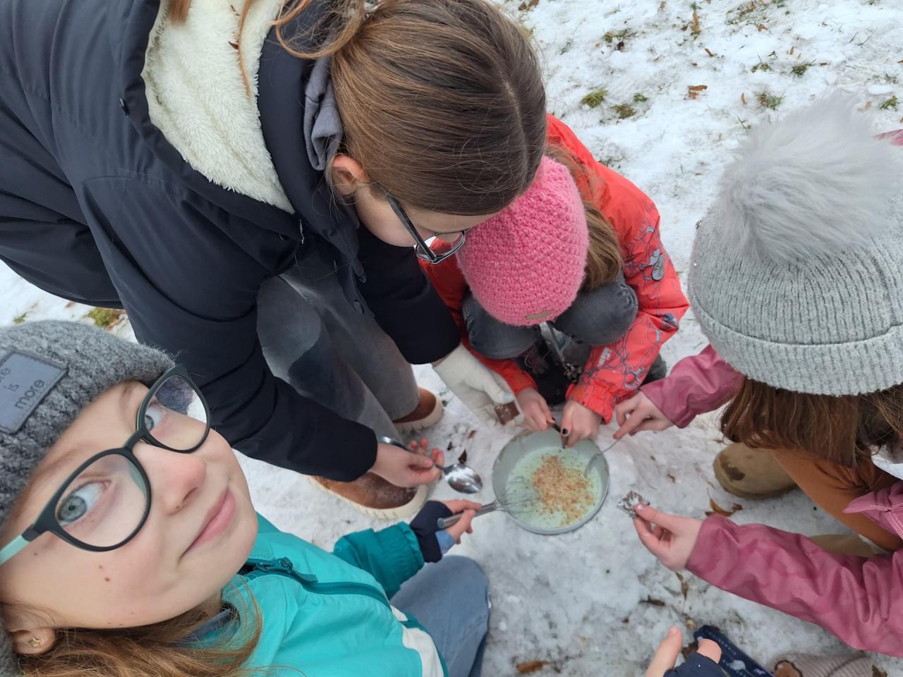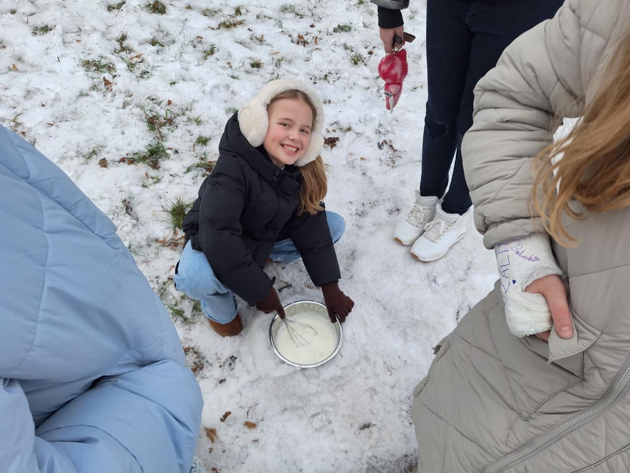 V hodině tělesné výchovy si třída 5.A užila netradiční zimní aktivitu na čerstvém vzduchu. Spojili jsme pohyb venku s jednoduchým experimentem – výrobou zmrzliny ze smetany přímo ve sněhu.