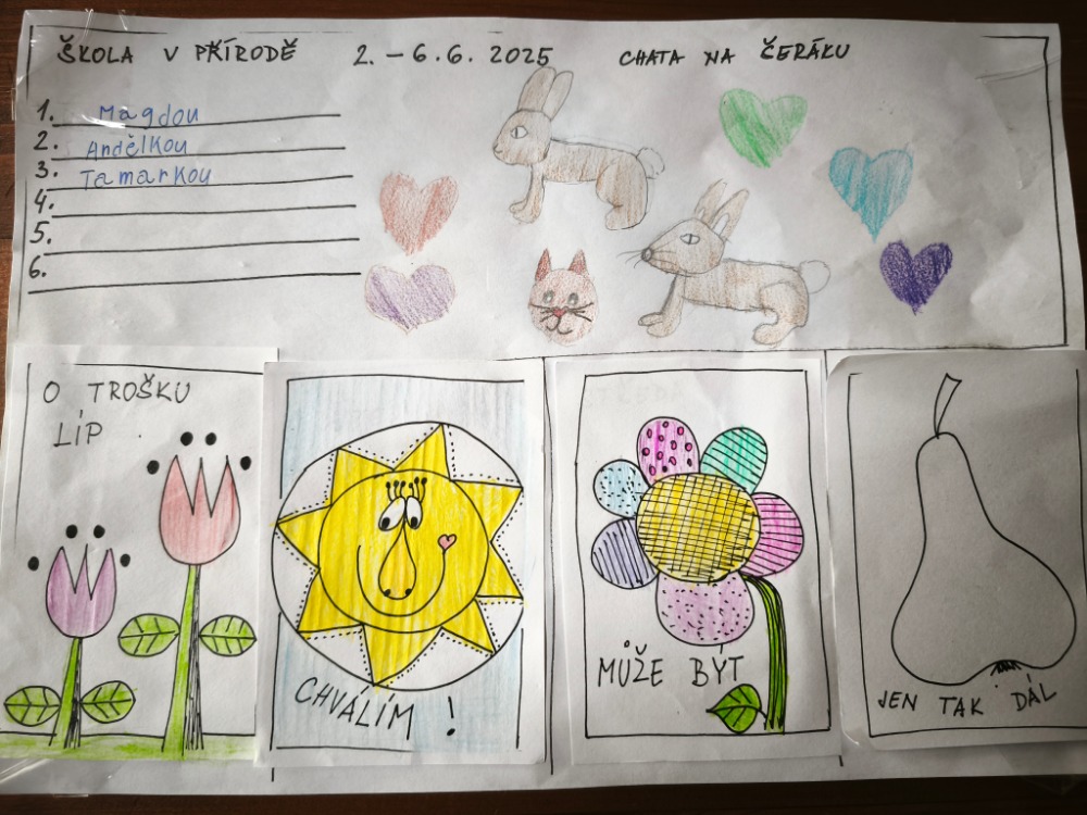 Sraz jsme měli na hlavním nádraží v Brně, kde začalo naše dobrodružství. Cesta vlakem byla dlouhá, ale vše jsme vydrželi, protože nás čekala přeprava lanovkami z Ramzové až nahoru na Šerák, kde jsme se ubytovali. Pokojíčky byly útulné, jídlo výborné, počasí nám vyšlo parádně. Dopoledne jsme se trošku učili a potom hurá do přírody. Šlapali jsme na Obří skály a další den na horu Keprník, mezitím jsme hráli hry, soutěžili v týmech, opékali špekáčky a kochali se výhledy do údolí . Pět dnů uteklo jako voda a my se lanovkami vrátili z dobrodružné výpravy do údolí zpět do běžných dnů.