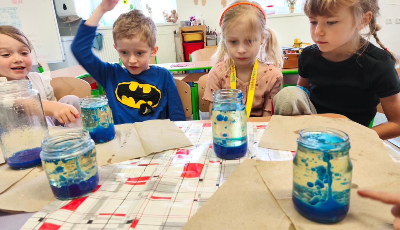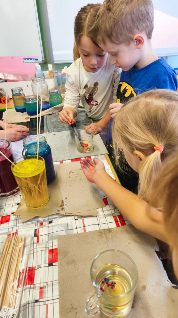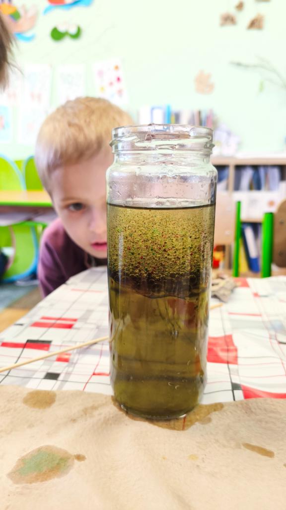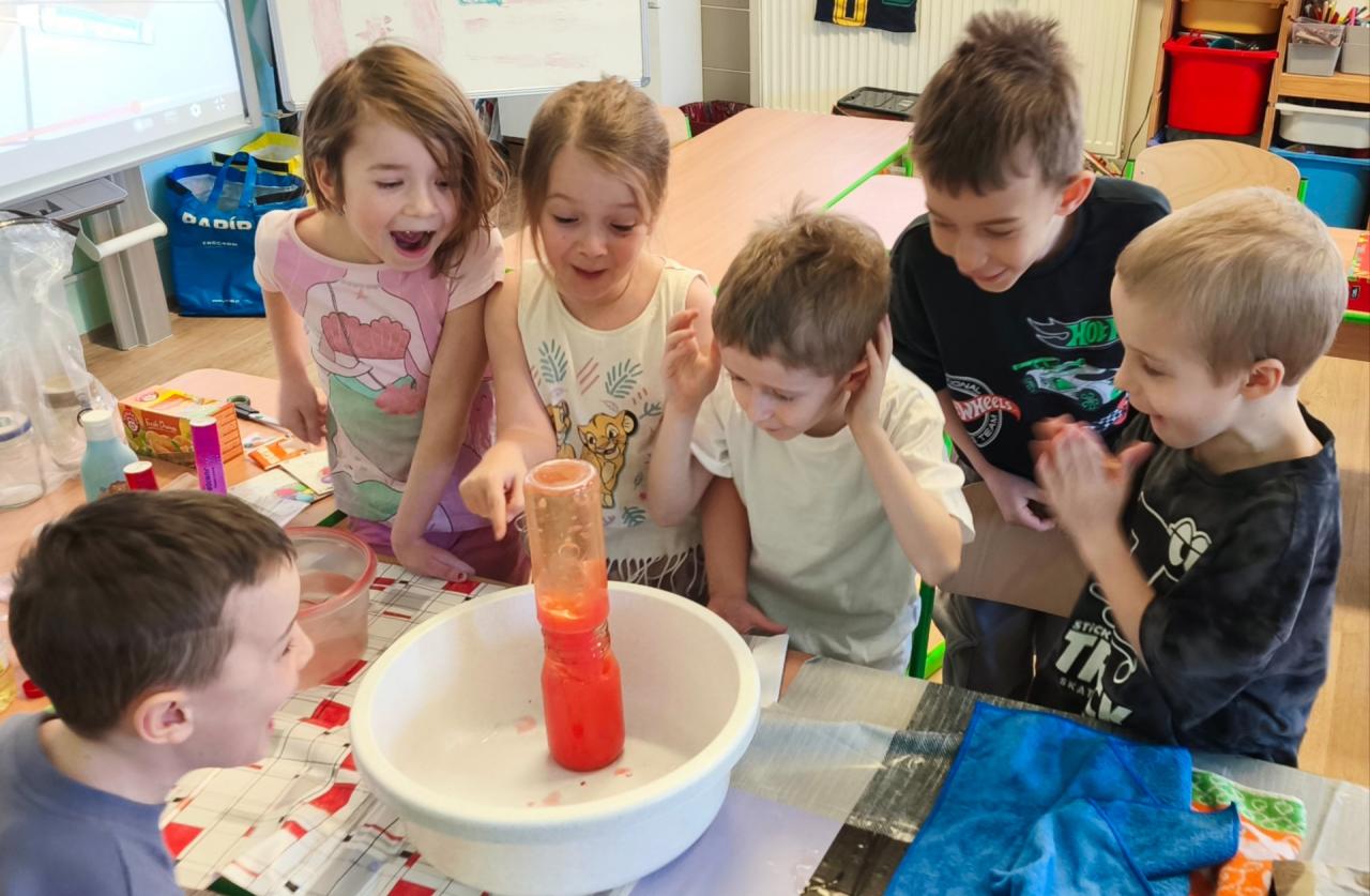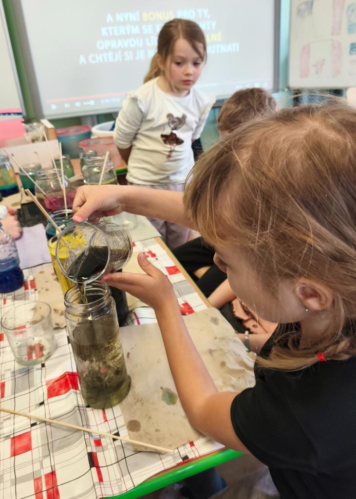 S pomocí vody, potravinářských barviv, temper, oleje a šumivých tablet jsme si s žáky vyrobili lávové lampy, barevný déšť a moře v láhvi. Po přidání šumivých tablet do nádoby s olejem a s obarvenou vodou začala barevná voda na dně v podobě šumivých bublin stoupat na hladinu vlivem oxidu uhličitého, který je lehčí než olej, po uvolnění oxidu uhličitého na hladině padaly bublinky barevné vody zpátky ke dnu. Tak nám vznikl efekt lávové lampy. Že má voda větší hustotu než olej, jsme si také vyzkoušeli přiložením sklenice s obarvenou vodou s folií na sklenici se stejným objemem oleje. Po vysunutí folie mezi sklenicemi si olej vyměnil pozici s vodou a dostal se nahoru. Radost dětí z objevování byla krásnou odměnou.