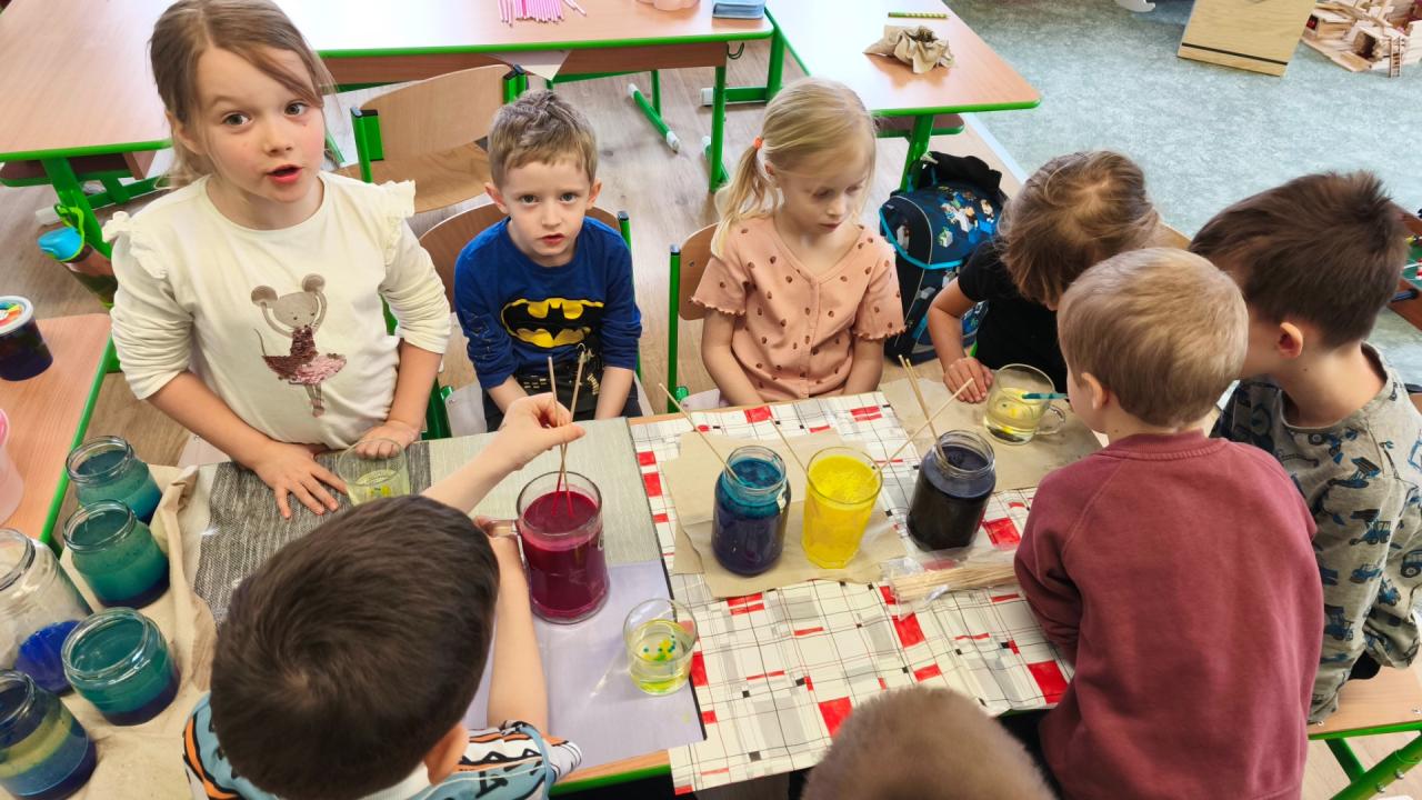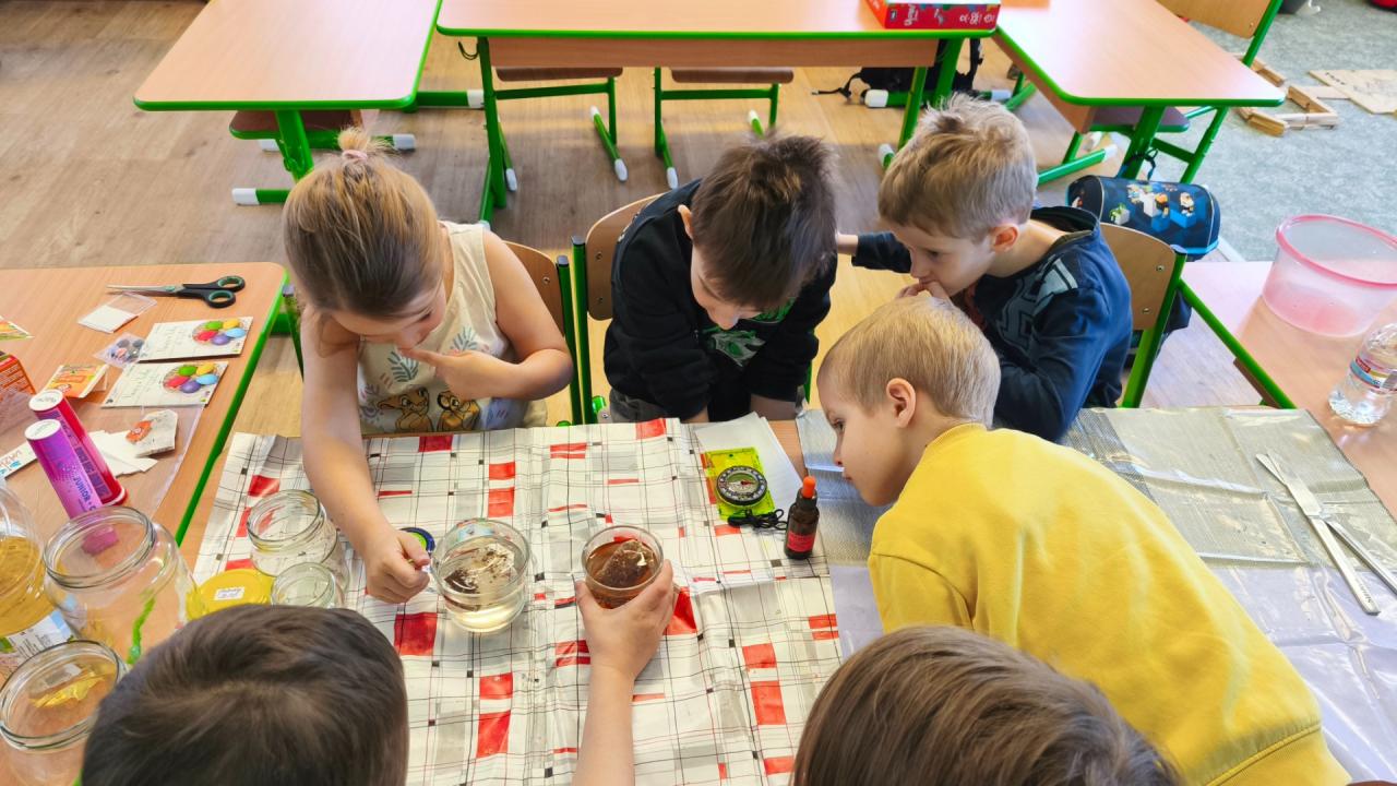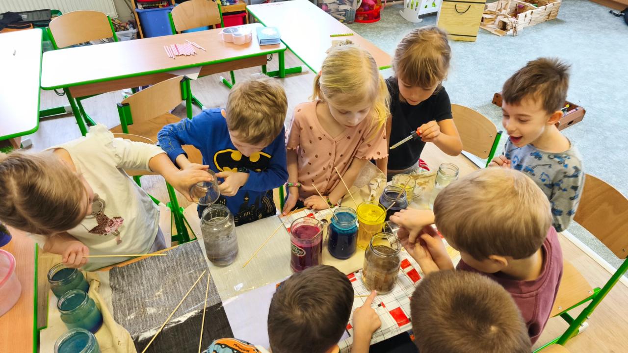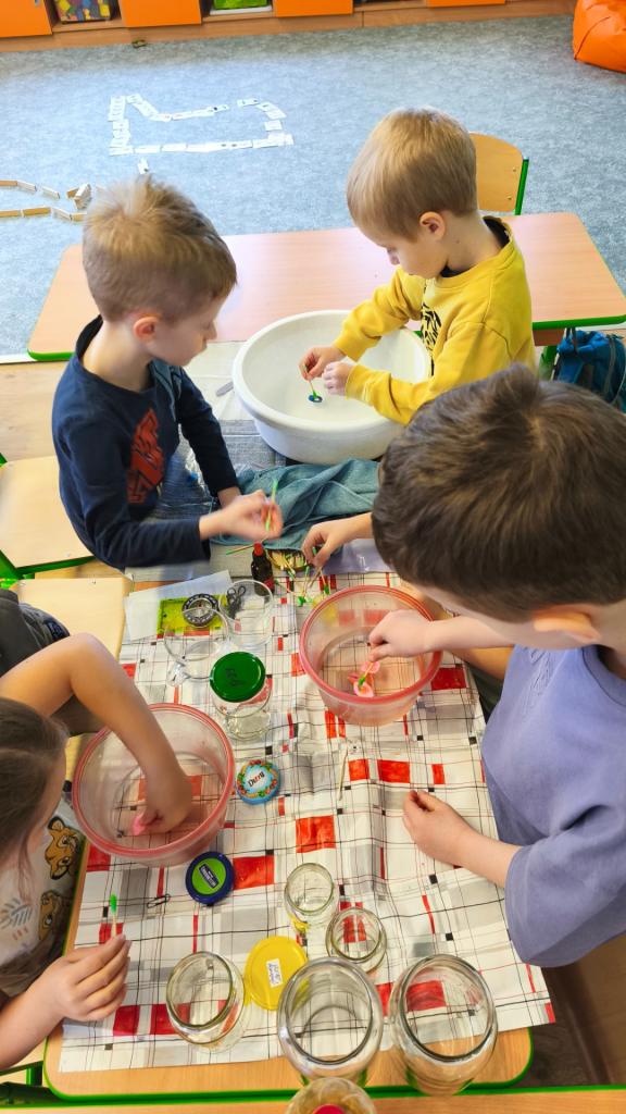 S pomocí vody, potravinářských barviv, temper, oleje a šumivých tablet jsme si s žáky vyrobili lávové lampy, barevný déšť a moře v láhvi. Po přidání šumivých tablet do nádoby s olejem a s obarvenou vodou začala barevná voda na dně v podobě šumivých bublin stoupat na hladinu vlivem oxidu uhličitého, který je lehčí než olej, po uvolnění oxidu uhličitého na hladině padaly bublinky barevné vody zpátky ke dnu. Tak nám vznikl efekt lávové lampy. Že má voda větší hustotu než olej, jsme si také vyzkoušeli přiložením sklenice s obarvenou vodou s folií na sklenici se stejným objemem oleje. Po vysunutí folie mezi sklenicemi si olej vyměnil pozici s vodou a dostal se nahoru. Radost dětí z objevování byla krásnou odměnou.