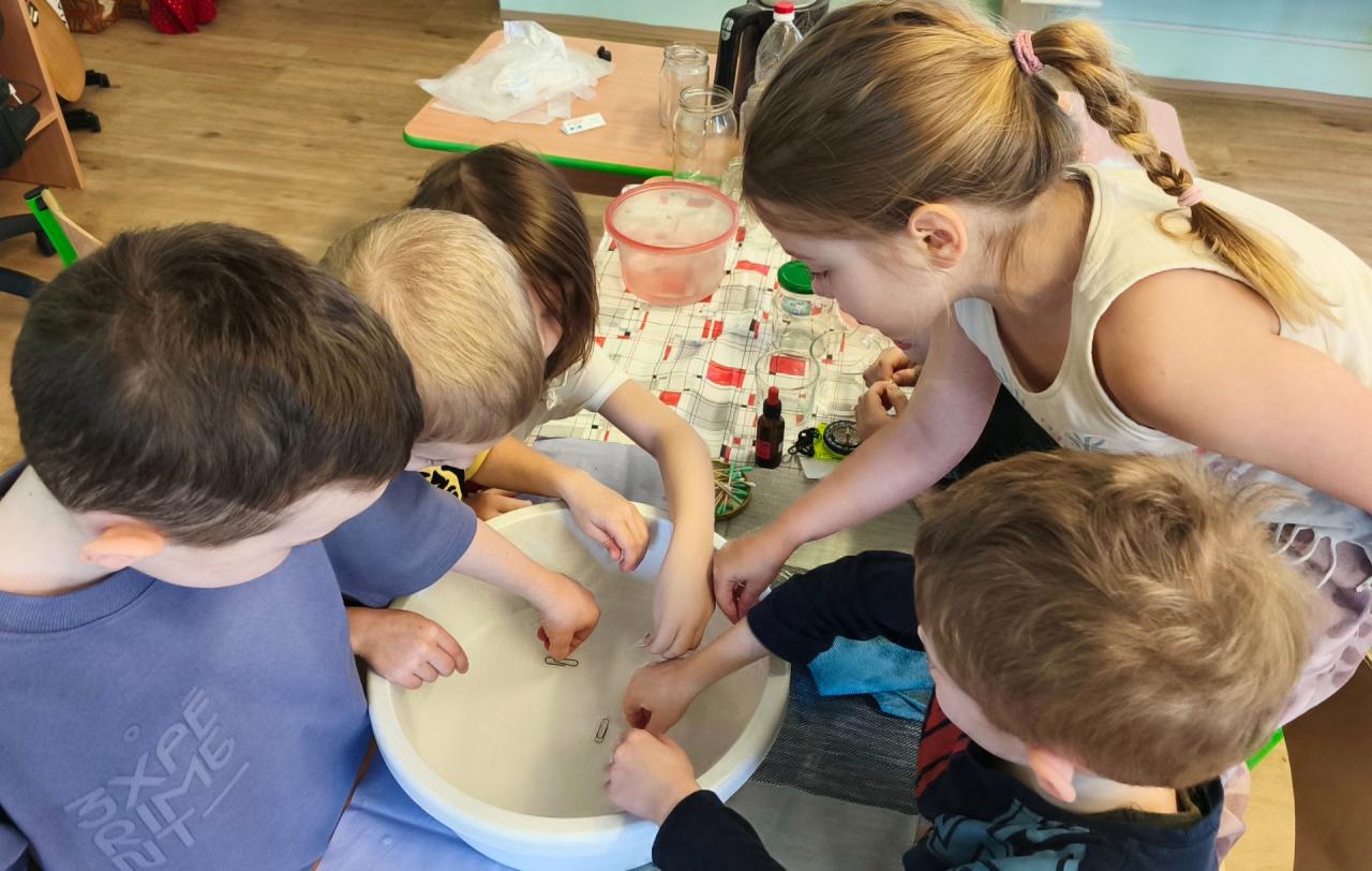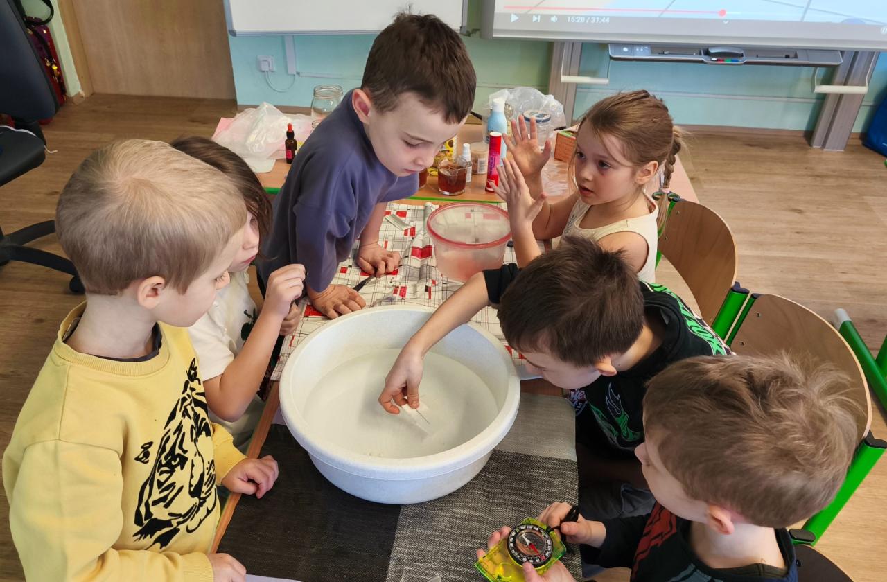 Dále jsme si ověřovali s pomocí buzoly, že zmagnetizovaná jehla na vodní hladině vždy směřuje na sever a jih i poté, co ji přitáhneme zmagnetizovaným předmětem do jiného směru. Velkou zábavou bylo propichování pytlíku naplněného vodou ostrými tužkami. Voda nevyteče, otvor kolem tužky se zacelí právě díky povrchovému napětí a tlaku vody. Ze stejného důvodu je také důležité, jakým způsobem zaléváme čajový sáček. Pokud ho nejprve vložíme do nádoby a poté zalijeme vodou, sáček zůstane pod vodní hladinou. Pokud nejprve nalijeme vodu do nádoby a poté do ní vložíme sáček s čajem, bude plavat na vodě. Jestliže ho vložíme opatrně do nádoby s vodou ke dnu, zůstane na dně.